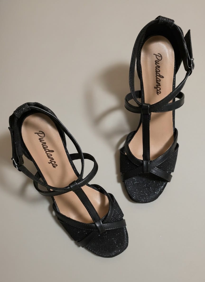 A Sandália Charme Baile Glitter Preto é puro glamour! Seu design delicado combina o PU preto premium com detalhes em glitter preto, criando um visual sofisticado e versátil, perfeito para bailes, festas, apresentações ou eventos especiais.