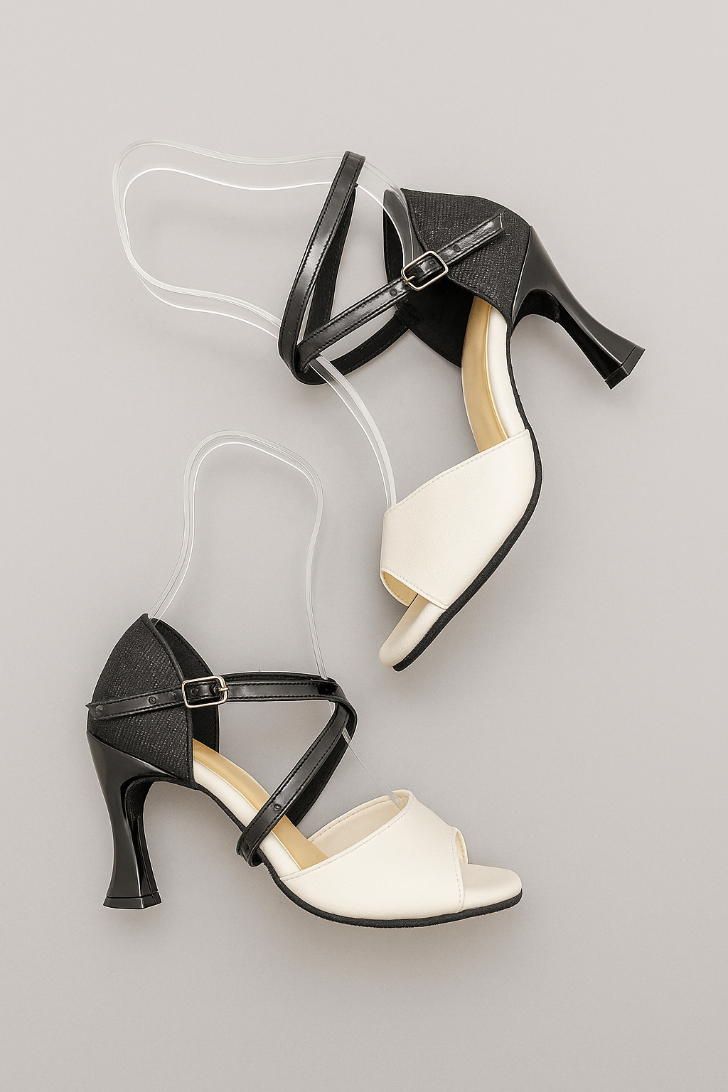 O modelo da foto traz o contraste sofisticado entre o preto e o off-white, mas aqui na Puradança, o design é só o ponto de partida. Você escolhe cada detalhe: pode trocar as cores, definir o tipo de salto (taça ou agulha) e ainda escolher o solado ideal para o seu estilo, o urbano, com mais aderência, ou o camurça, que desliza com leveza sobre o piso.