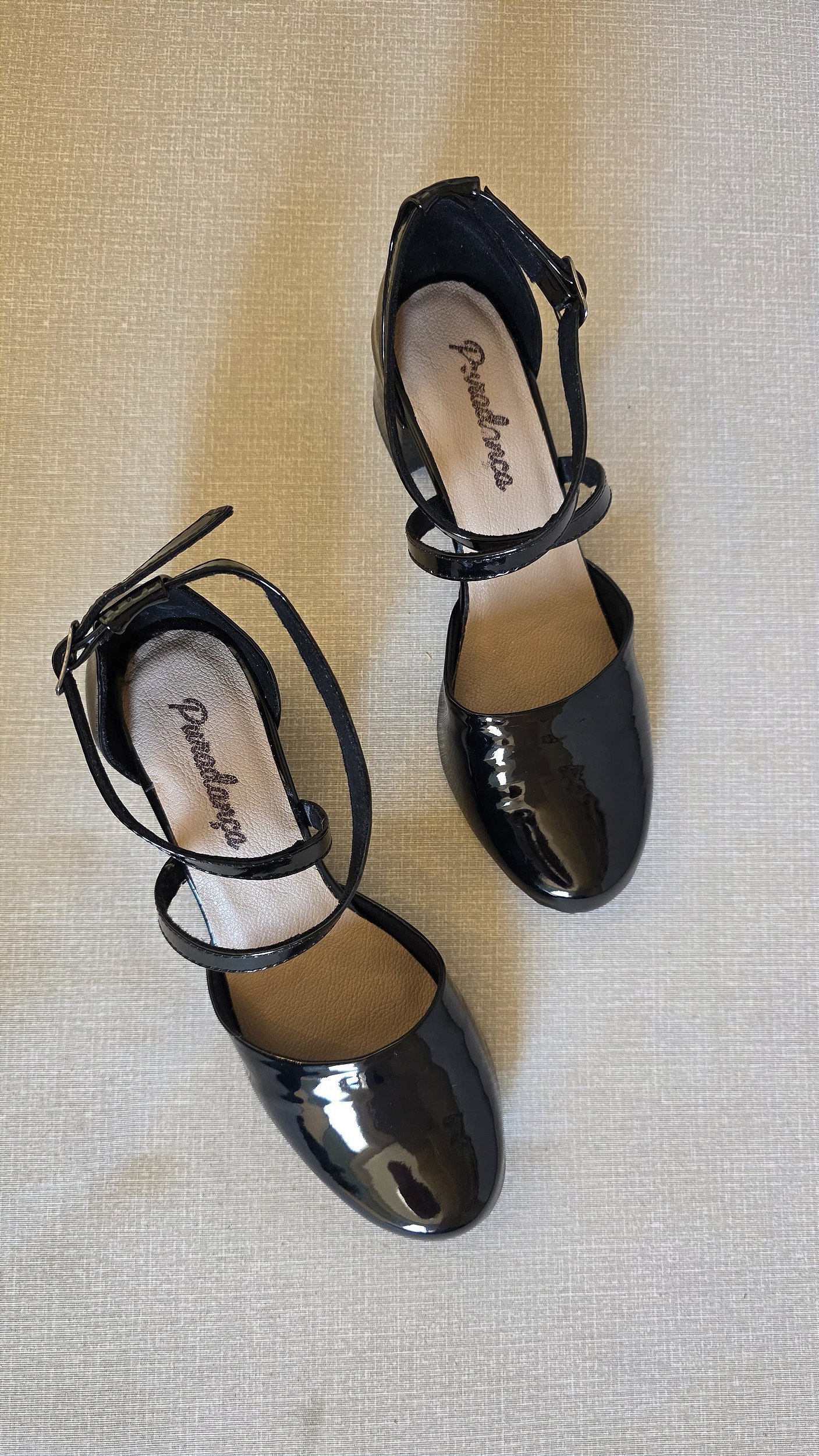 O Sapato Boneca Moderno traz o brilho sofisticado do verniz preto premium em um design repensado, com duas tiras cruzadas no tornozelo que garantem firmeza e valorizam o pé com um toque de modernidade e delicadeza.